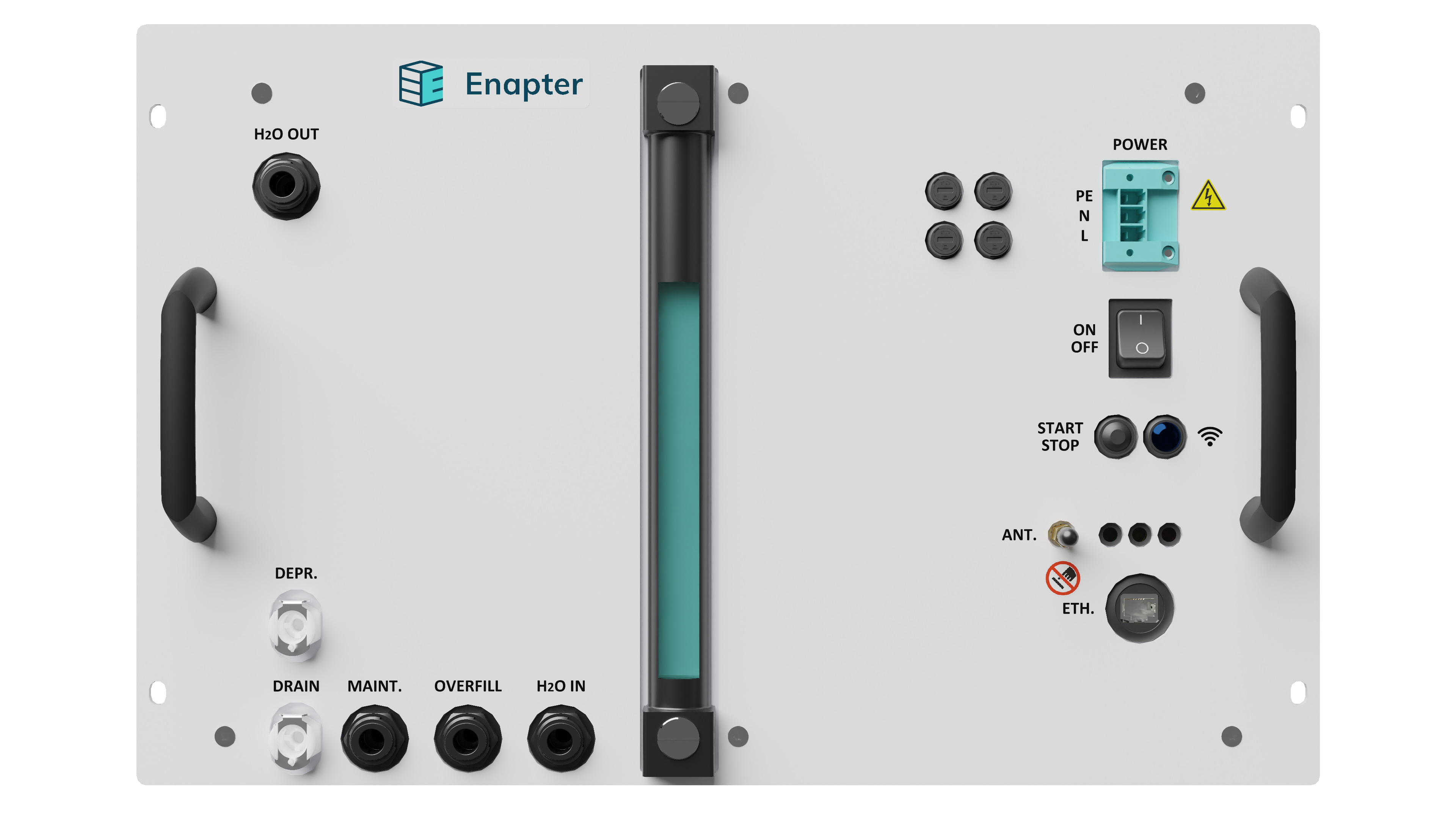 Enapter’s Water Tank 4.1 provides storage for 28.5 liters of clean water for the AEM electrolyser. The water tank is rack mountable into a standard 19” cabinet. The tank contains a conductivity sensor and a pump system to supply up to 12 AEM electrolysers with clean water.
